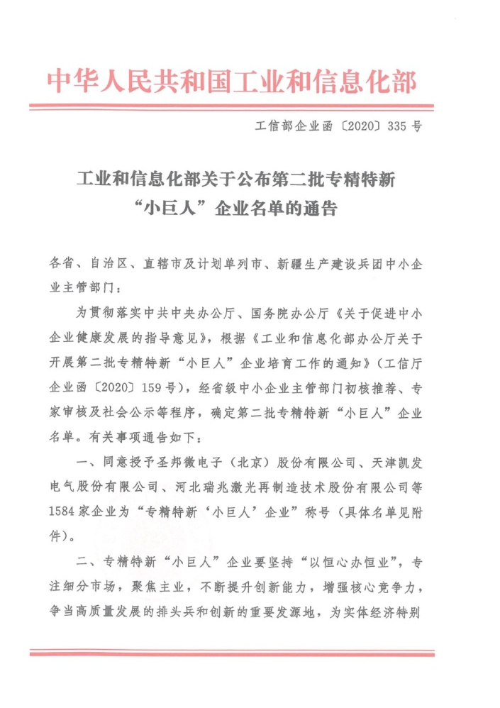 2020年12月11日,我公司被國家工業和信息化部認定為第二批專精特新“小巨人”企業。